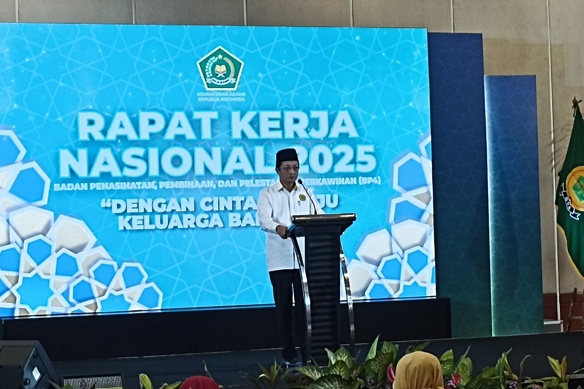 Menteri Agama (Menag) Nasaruddin Umar memberikan pidato di Rakernas Badan Penasihat Pembinaan, dan Pelestarian Perkawinan (BP4) 2025 di Jakarta (22/4) malam. (Hilmi/Jawa Pos)