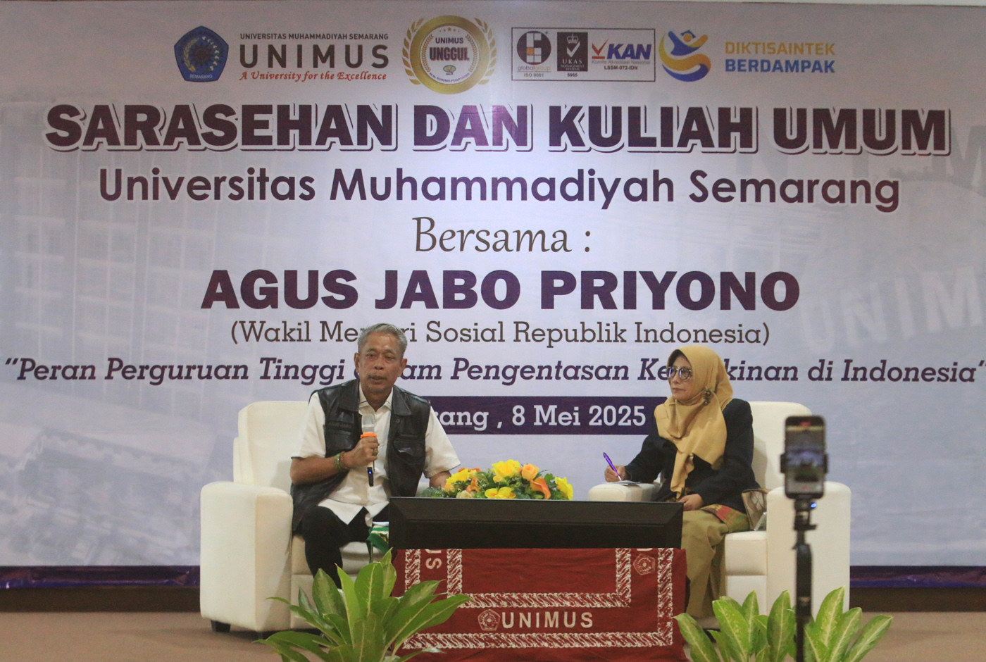 Wakil Menteri Sosial Agus Jabo Priyono di Universitas Muhammadiyah Semarang, Jawa Tengah, Kamis (8/5/2025). (Nur Chamim/Jawa Pos Radar Semarang)