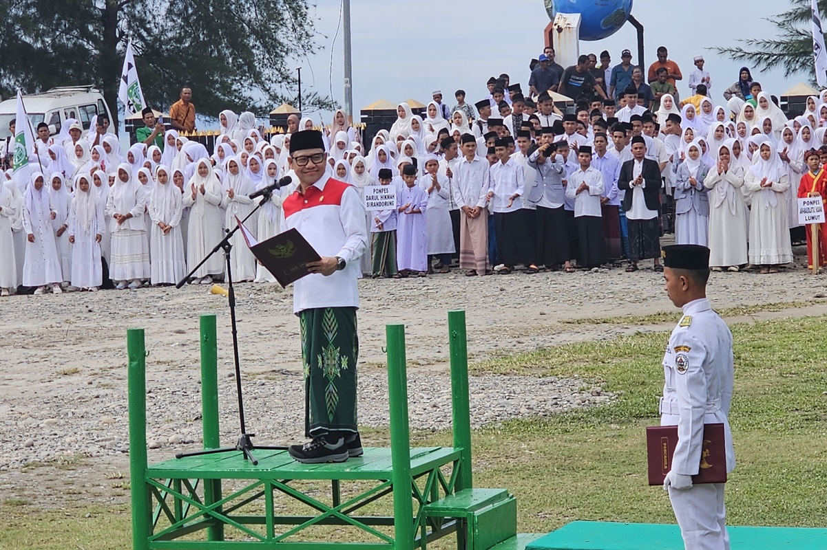 Menko PM Muhaimin Iskandar alias Cak Imin memimpin apel Hari Santri Nasional 2025 di Lapangan Titik Nol Peradaban Islam, Barus, Tapanuli Tengah, Sumut, Rabu (22/10). (Ridwan/JawaPos.com)