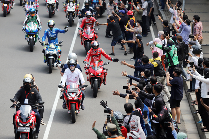 Sejumlah pembalap MotoGP saat mengikuti dengan rute Istana Merdeka - MH Thamrin, Jakarta, Rabu (16/3/2022). Parade tersebut merupakan bentuk apresiasi atas kerja keras Pemerintah dalam mempersiapkan pagelaran MotoGP Mandalika pada 18-20 Maret 2022. Foto: