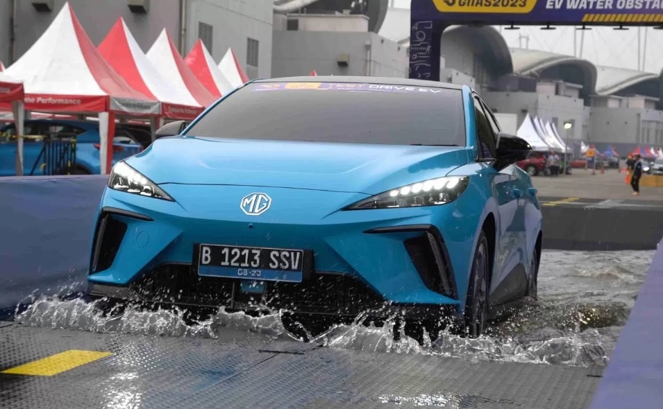 MG 4 EV saat dijajal di arena basah-basahan di GIIAS 2023. (Rian Alfianto/JawaPos.com)