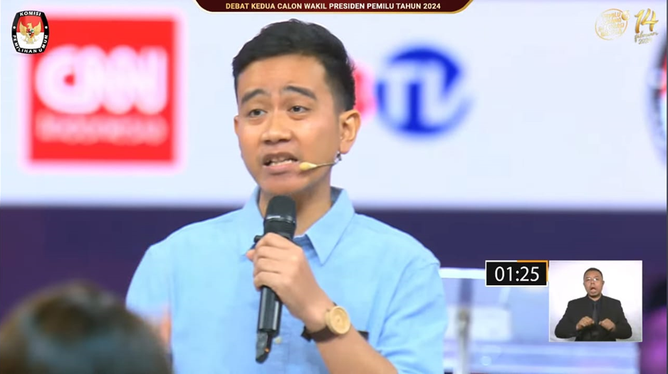 Gibran Rakabuming Raka Calon Wakil Presiden Nomor urut 2 yang sedang menjelaskan visi misi dalam debat Cawapres Pemilu Tahun 2024./ Tangkapan Layar Youtube @KPU