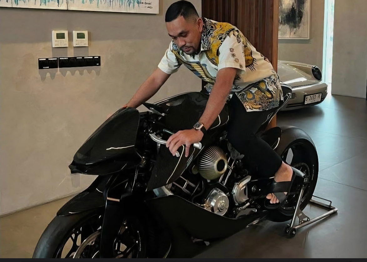 Ahmad Sahroni flexing menunggangi motor sport Aston Martin AMB 001, yang hanya diproduksi 100 unit di seluruh dunia, yang harganya dibanderol Rp 3 M. (Istimewa)
