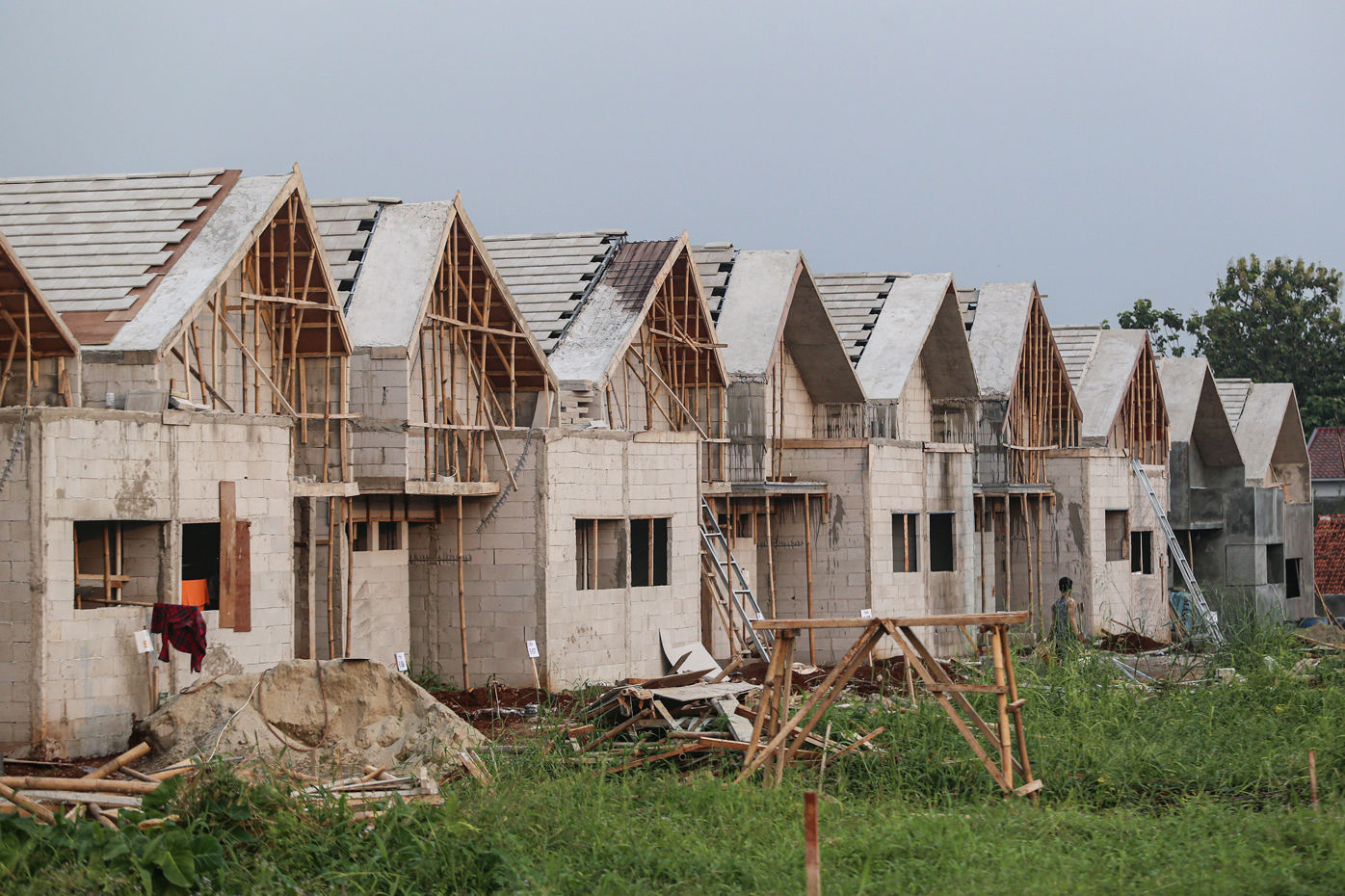 Pekerja menyelesaikan pembangunan perumahan di kawasan Depok, Jawa Barat, Rabu (31/5/2023).