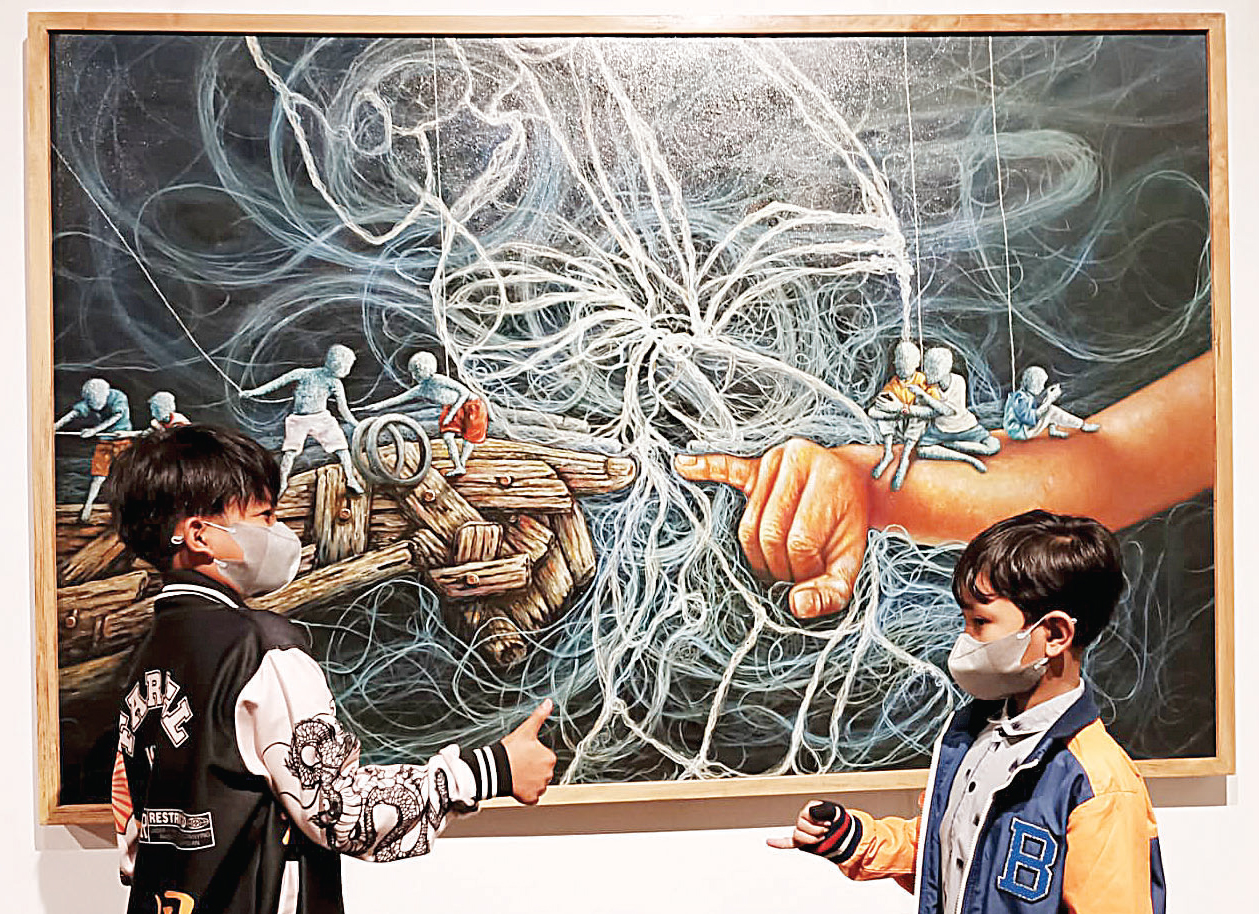 BAHAGIA: Musisi cilik Farel Prayoga (kiri) dan adiknya menduplikasi lukisan Suit karya Rendra Sanjaya di ArtOs Nusantara, Bayuwangi.