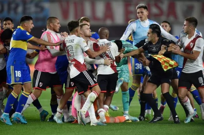 Insiden perkelahian massal terjadi di superclasico River Plate kontra Boca Juniors. Wasit sampai mengeluarkan tujuh kartu merah usai insiden tersebut.
