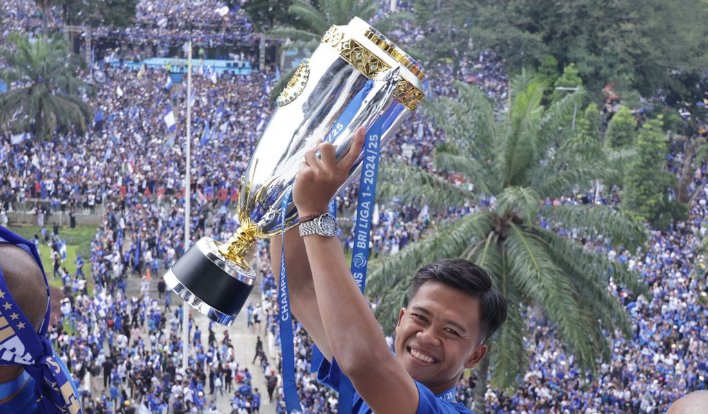 Edo Febriansah berpose dengan trofi Liga 1 saat membawa Persib juara musim 2024/2025. (‎Media Persib Bandung)