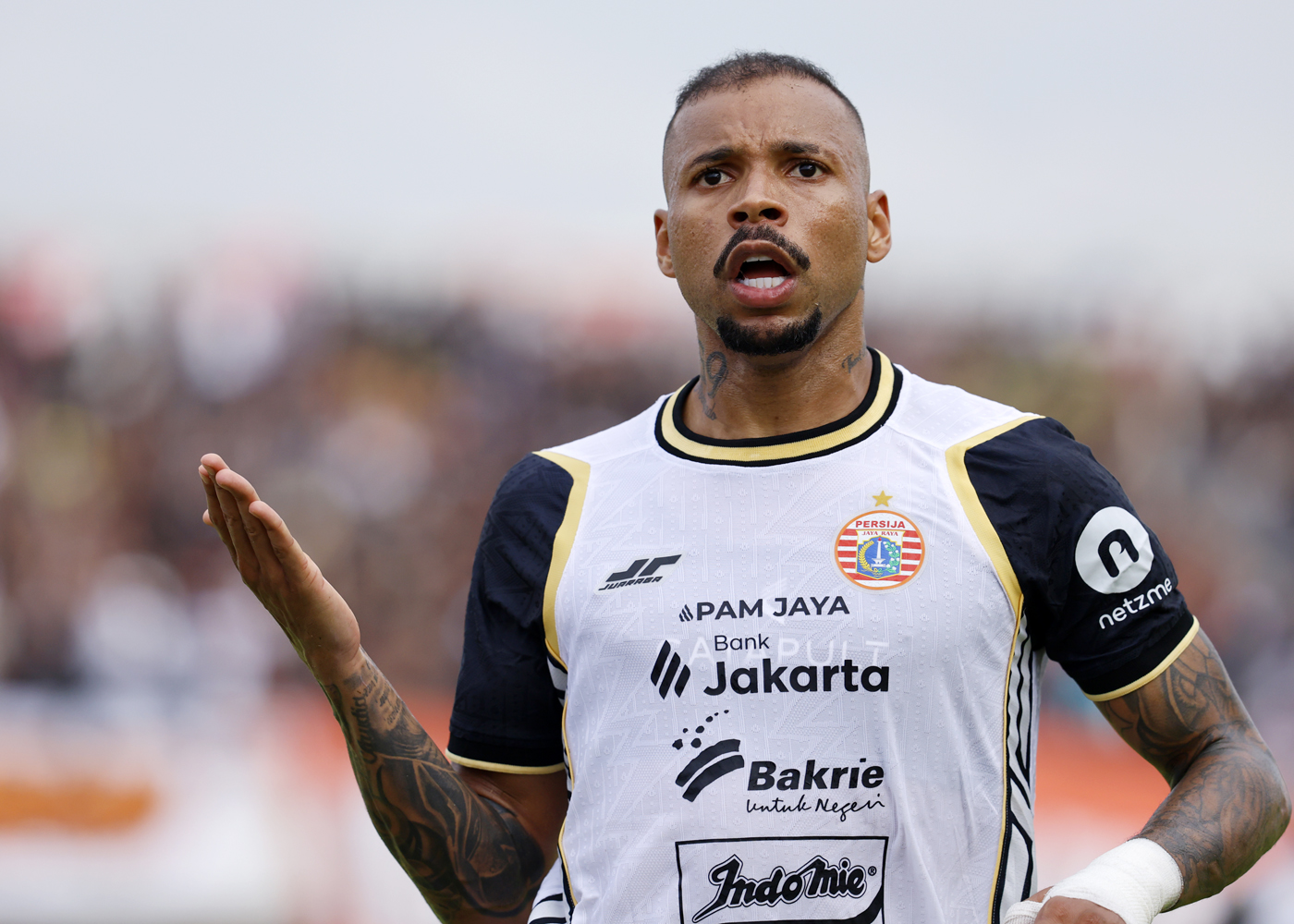Pemain Persija Jakarta Gustavo Almeida Dos Santos melakukan selebrasi usai membobol gawang Persita Tangerang pada pertandingan Super League di Stadion Sport Center Tangerang, Banten, Jumat (30/1/2026). (Dery Ridwansah/ JawaPos.com)