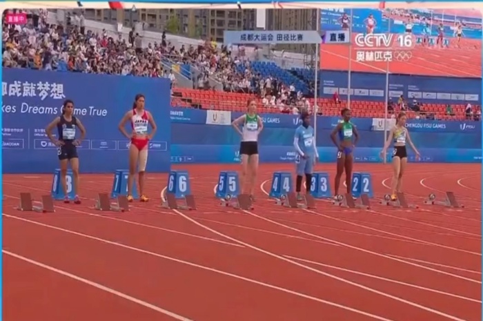 Tangkapan layar saat Nasra Abubakar Ali, sprinter Somalia (tiga kanan), mengikuti lomba FISU World University Games 2023. (twitter)