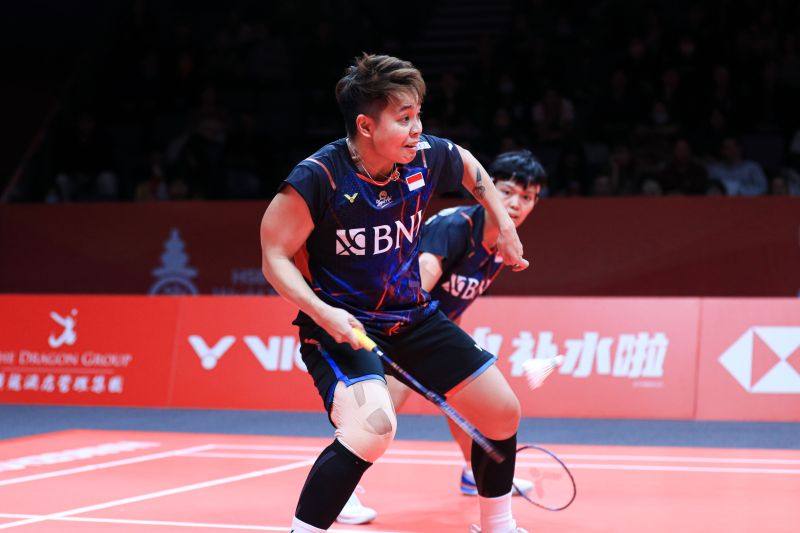 Ganda putri Indonesia Apriyani Rahayu/Siti Fadia Silva Ramadhanti saat berlaga di babak ketiga BWF World Tour Finals 2023 di Hangzhou, China, Jumat (15/12/2023). (ANTARA/HO/PP PBSI)