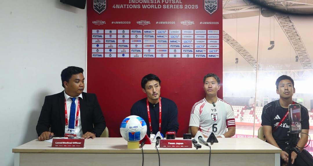 Pelatih Timnas Futsal Jepang, Kensuke Takahashi usai dikalahkan Timnas Futsal Indonesia di 4 Nations World Series 2025. (Dimas Ramadhan/JawaPos.com)