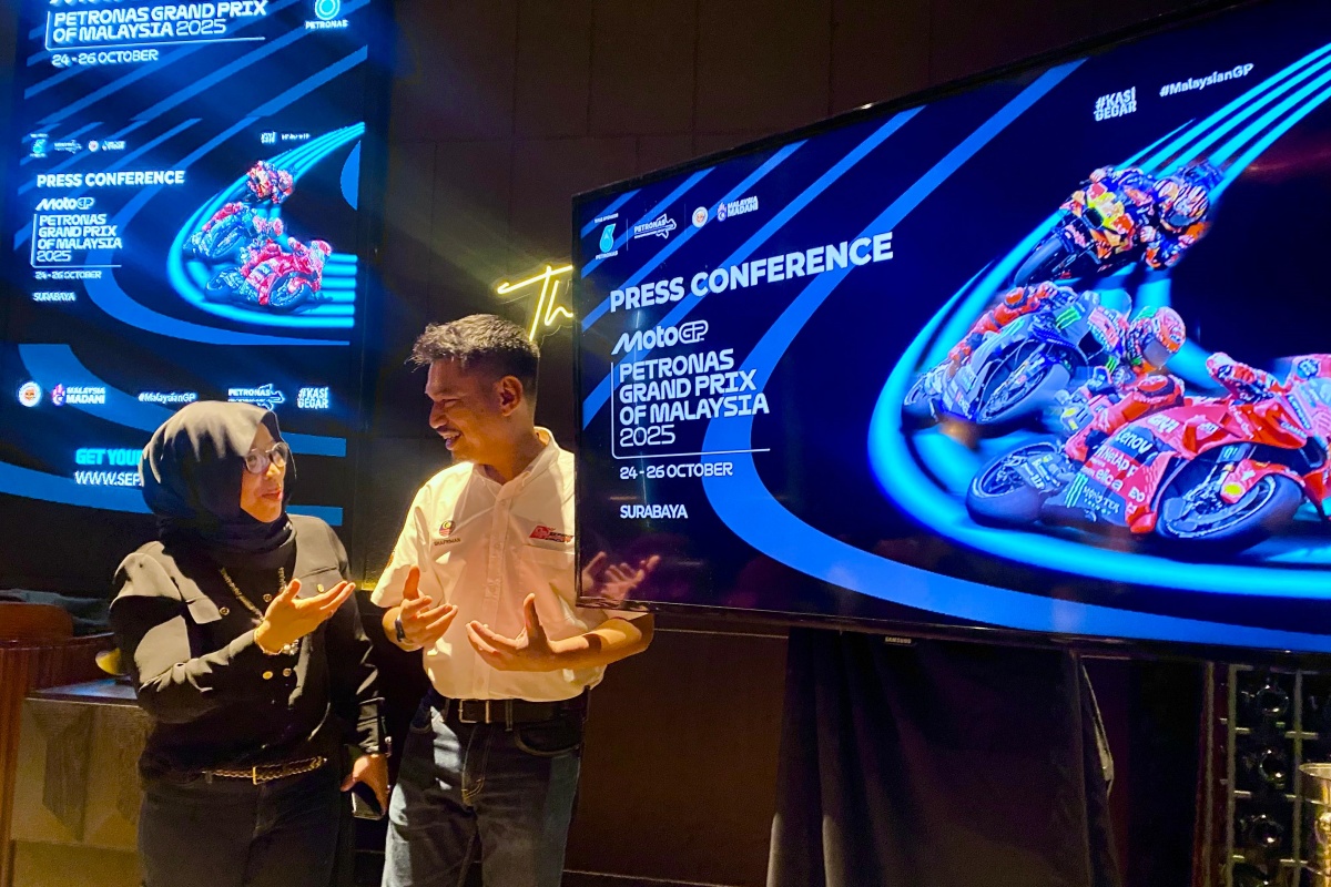 CEO PETRONAS Sepang International Circuit Azhan Shafriman Hanif (kanan) dalam konferensi pers roadshow MotoGP Malaysia 2025 di Surabaya, Kamis (3/7). (Juliana Christy/Jawa Pos)