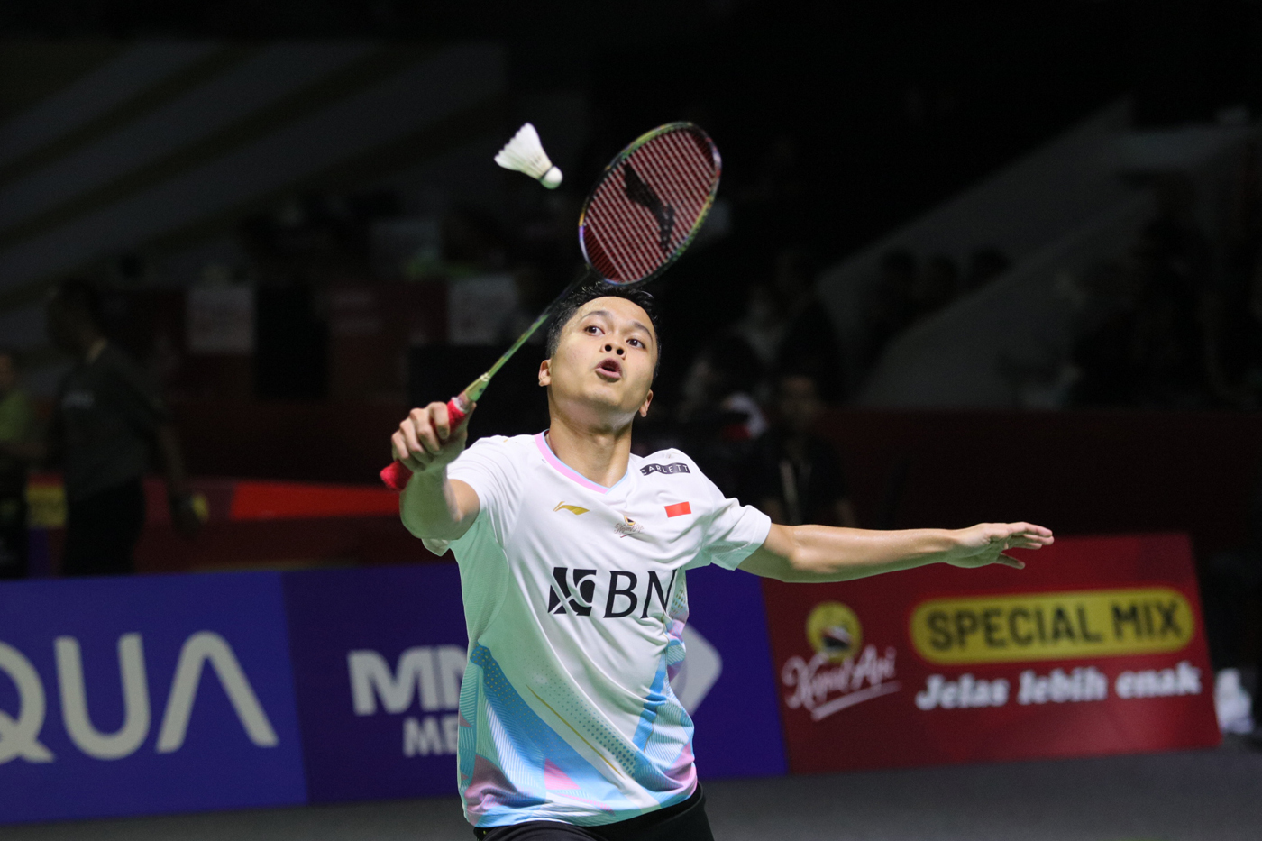 Pebulu tangkis tunggal putra Indonesia Anthony Sinisuka Ginting mengembalikan kok ke arah lawan pebulu tangkis asal Jepang Kenta Nishimoto dalam babak 32 besar Indonesia Open 2024 di Istora Senayan, Jakarta, Selasa (4/6/2024). Ginting kalah dalam rubber g