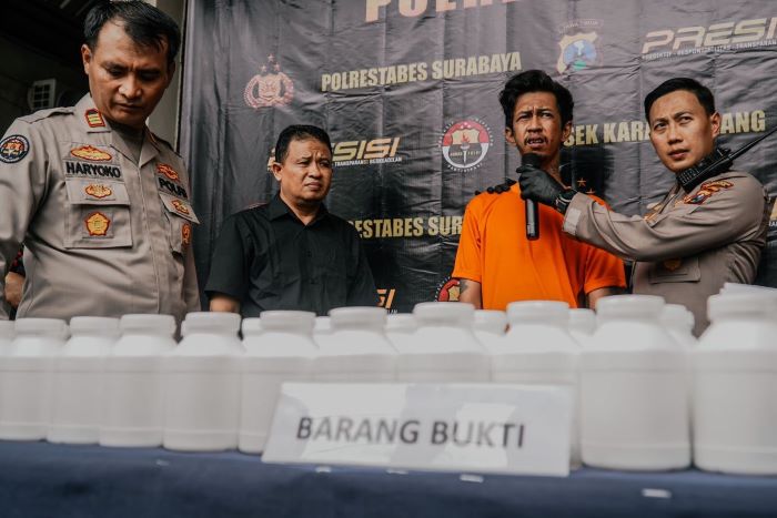 Polsek Karangpilang bekuk dua kurir pil koplo dan mengamankan ribuan barang bukti.