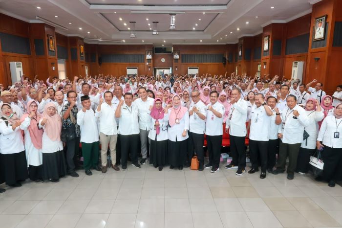 Wali Kota Surabaya Eri Cahyadi bersama kepala sekolah, para guru dan tenaga pendidikan SD dan SMP negeri/swasta se-Surabaya di Gedung Sawunggaling, Rabu (3/1).