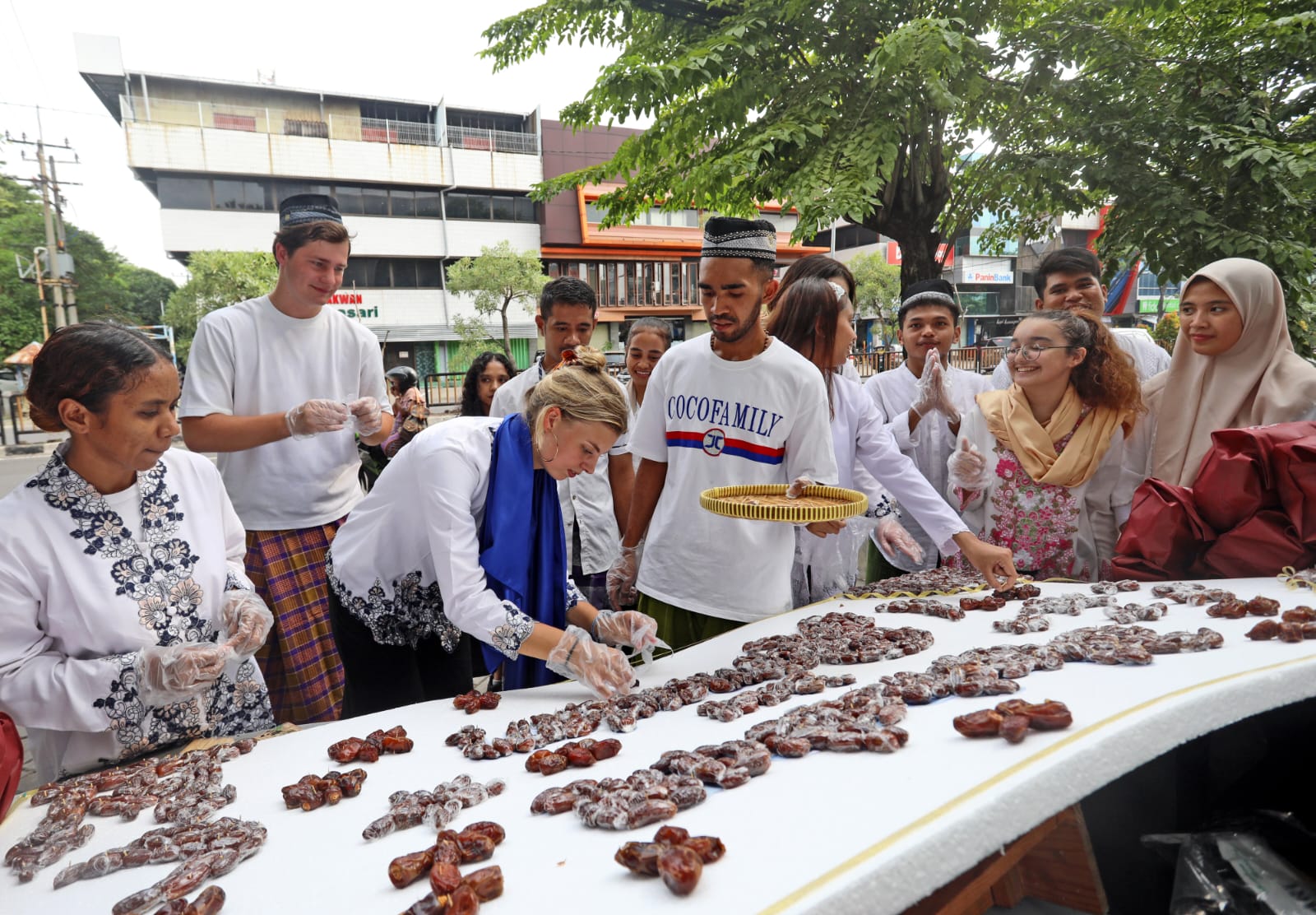 Mahasiswa asing Ubaya saat menyusun ratusan buah kurma menjadi karya seni.