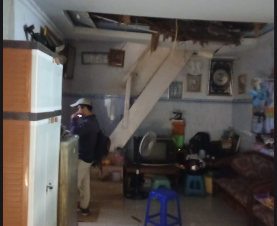 Petugas melakukan survei rumah yang ambruk di Kupang Gunung Barat, Surabaya. (Kecamatan Sawahan)