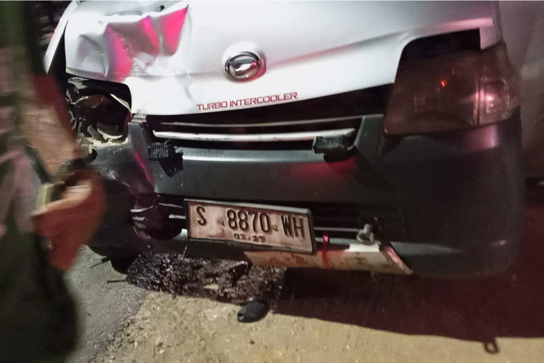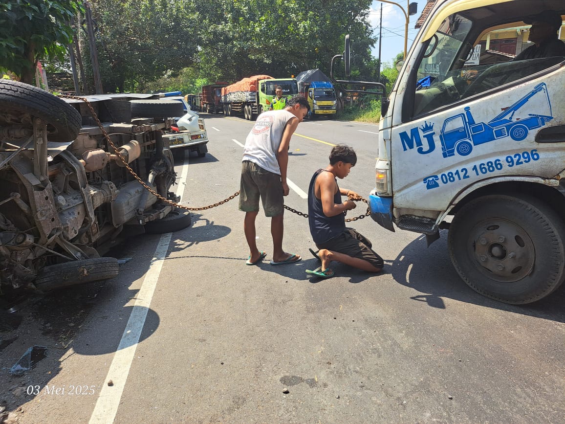 Nobil derek mengevakuasi mobil Toyota Calya yang kecelakaan adu banteng di Sidoarjo, Sabtu pagi (3/5). (Satlantas Polres Sidoarjo)