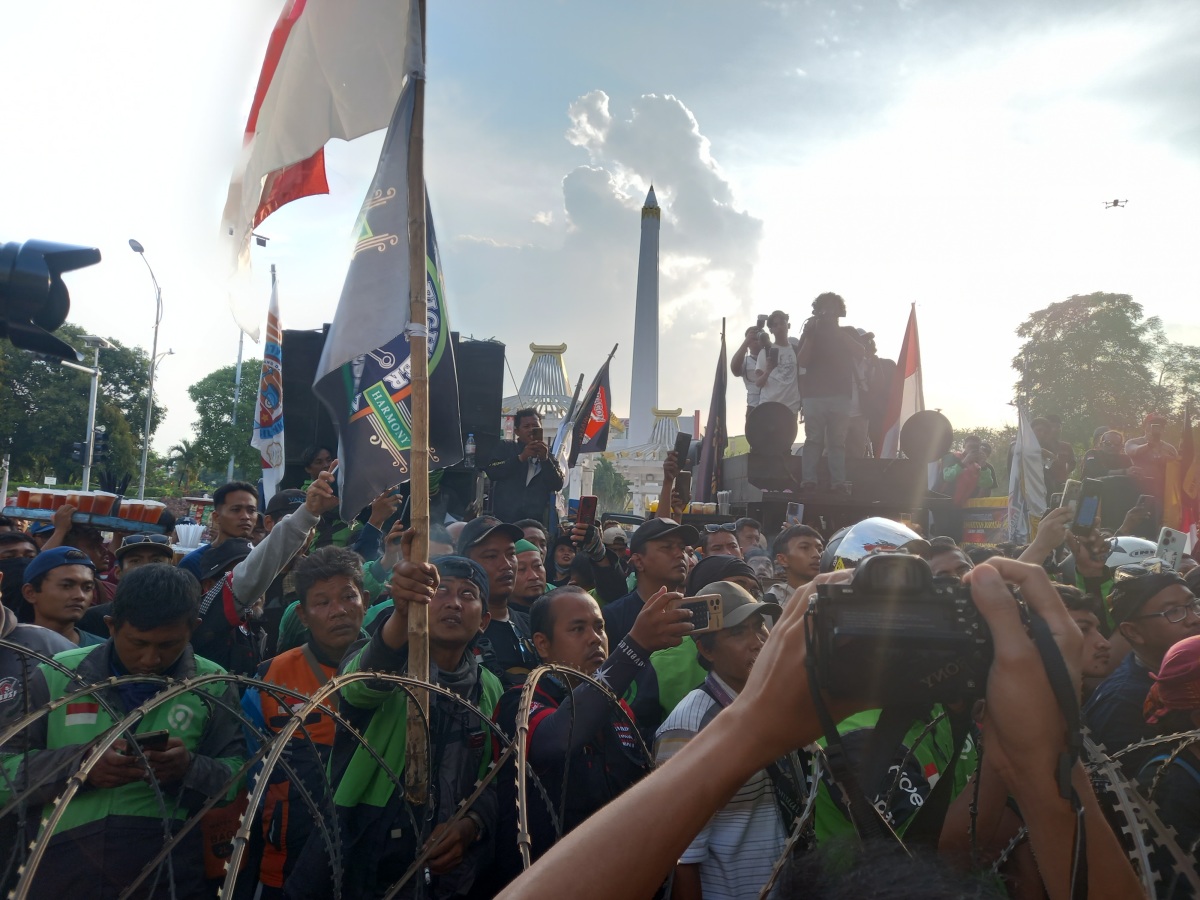 Aksi demo ribuan ojol di depan Kantor Gubernur Jawa Timur, Selasa (20/5). (Novia Herawati/ JawaPos.com)