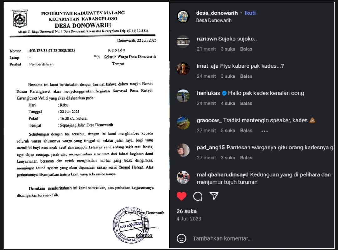 Surat pemberitahuan Pemerintah Desa Donowarih (kiri) dan tangakapan layar kolom komentar unggahan Instagram Desa Donowarih. (Istimewa)