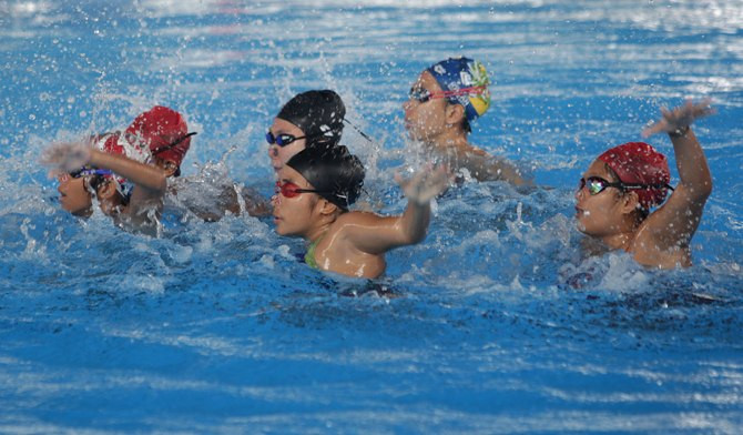 Tim renang indah Indonesia sedang berlatih di Stadion Akuatik GBK