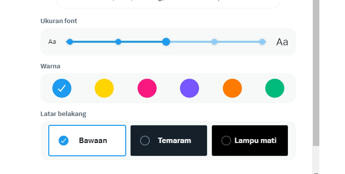 Sebagaimana diketahui, saat ini Twitter punya beberapa opsi untuk tampilan. Cara mengubah tampilan Twitter berada di pengaturan, secara default terdapat tiga pilihan: bawaan, temaram, dan lampu mati. Pengguna juga dapat mengubah warna tautan, tombol, dan ukuran huruf di platform tersebut melalui pengaturan tampilan.