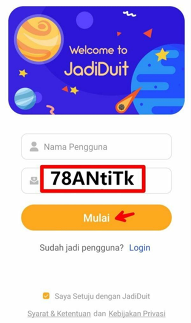 Pertama, unduh Jadiduit. Di layar awal kamu akan diminta mengisi Nama Pengguna dan Kode Undangan. Kamu dapat menginput Kode Undangan : 78ANtiTk. Dengan kode ini, kamu akan mendapatkan 200 Emas sebagai modal awal.