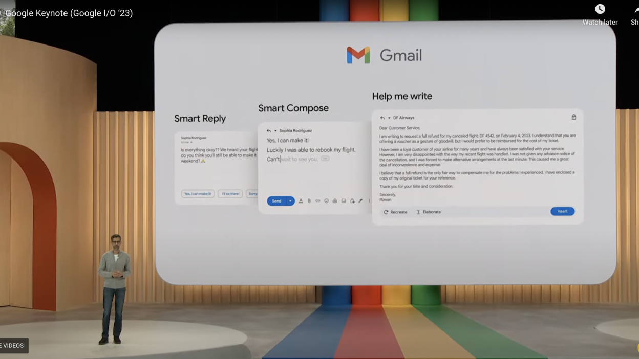CEO Google, Sundar Pichai, mencontohkan dengan meminta pengembalian dana tiket pada maskapai penerbangan saat mengumumkan fitur Help Me Write.