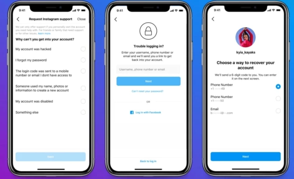 Jika Anda tidak bisa masuk, Anda bisa mengunjungi hub di situs web Instagram. Instagram akan menanyakan apakah masalah tersebut menyangkut akun yang diretas, lupa kata sandi, peniruan identitas, kehilangan metode autentikasi dua faktor, atau akun yang dinonaktifkan.