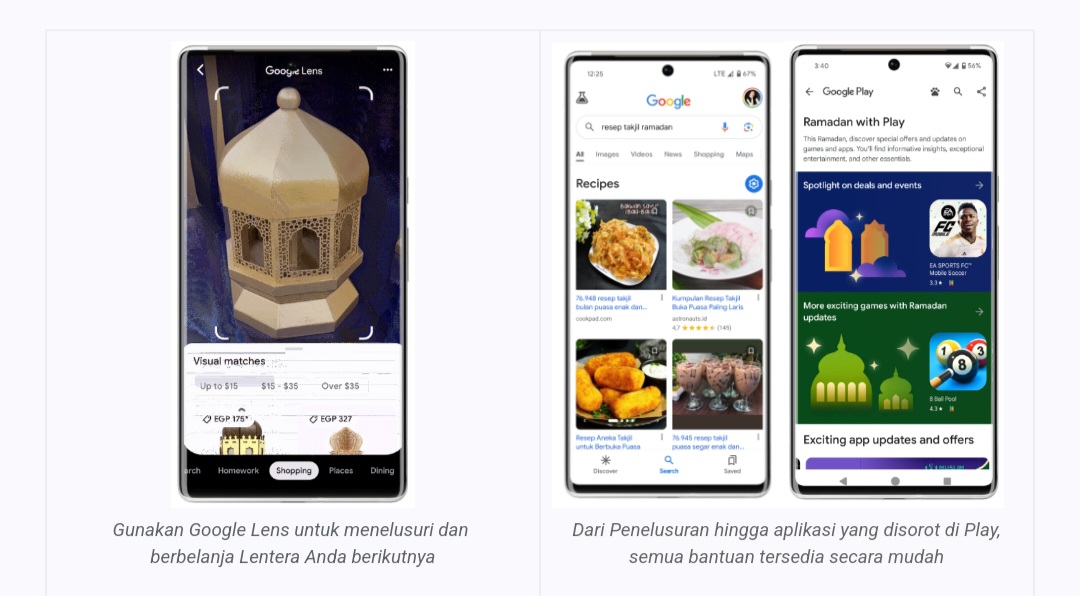 Beberapa fitur Google juga membantu kita dalam memeriahkan Ramadhan. Pertama, kita bisa berbelanja sesuai dengan apa yang kita lihat dengan mudah. Berpenampilan baru telah menjadi tradisi Lebaran tersendiri, baik tampilan diri ataupun rumah.