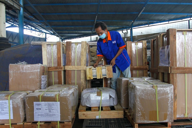 Petugas menyortir barang yang akan dikirimkan ke pelanggan di Gudang Jasa Pengiriman, Jakarta, Jumat (23/04/2021). Pemerintah akan memberikan subsidi ongkos kirim belanja daring atau online senilai Rp 500 miliar pada Hari Belanja Online Nasional (Harbolna