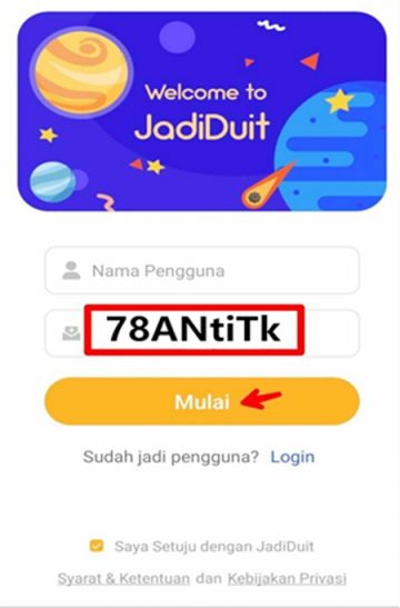 Unduh JadiDuit. Di layar awal kamu akan diminta mengisi Nama Pengguna dan Kode Undangan.