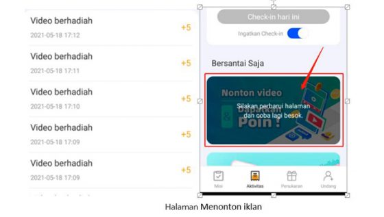 Kamu juga bisa menonton iklan (5 poin setiap iklan). Tentunya sangat menguntungkan sekali karena hanya dengan menonton video Anda akan mendapatkan poin.