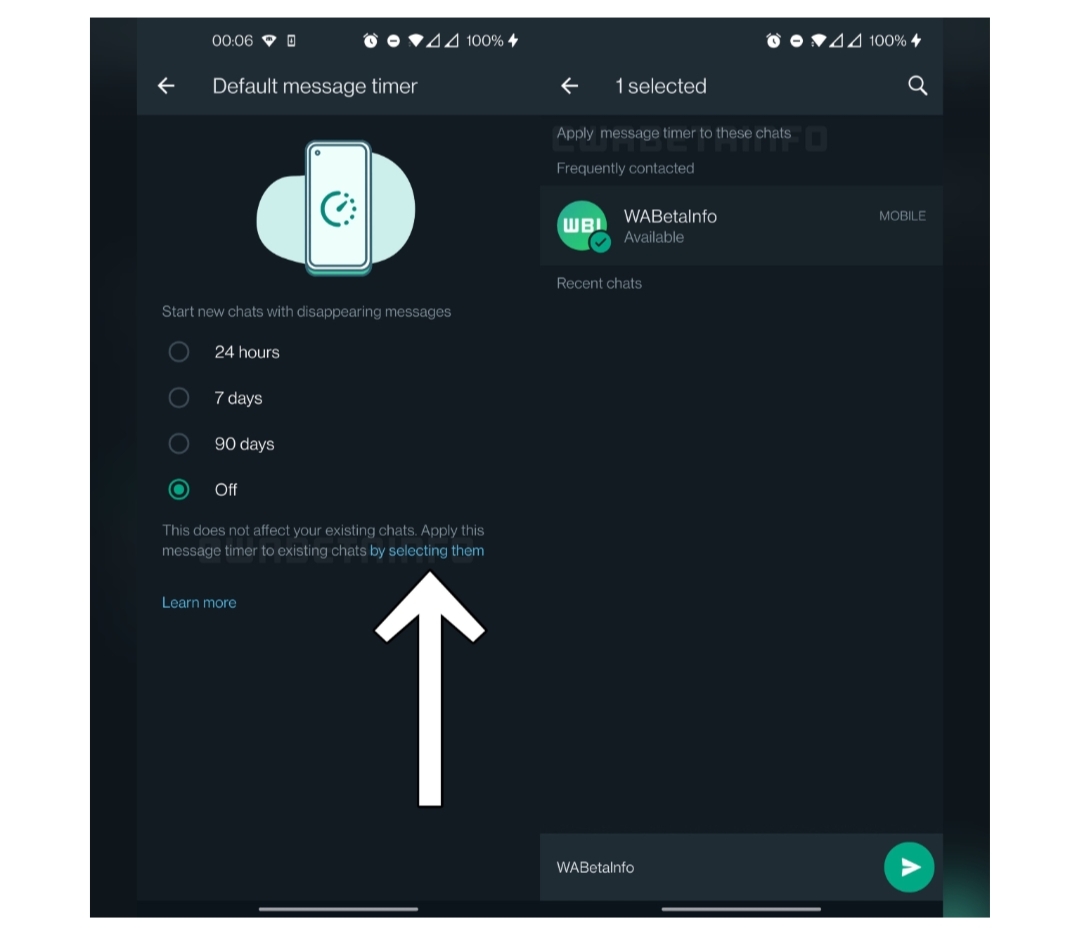 Jika saat ini opsi tersebut hanya berfungsi dengan obrolan baru, sekarang dimungkinkan untuk melakukannya secara selektif dengan semua, termasuk yang pesan yang lebih dulu ada. Hal ini dibuktikan dengan adanya layar atau screen khusus pengatur waktu opsional baru yang akan hadir di fitur Disappearing Message.