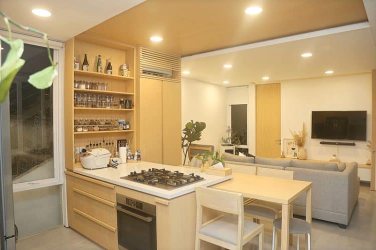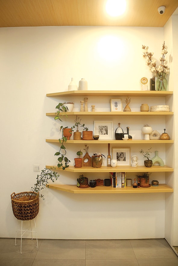 Nita cermat menggabungkan fungsi dan estetika. Misalnya, storage atau penyimpanan di area dapur yang secara tidak langsung terlihat seperti dekorasi ruangan. Tengok saja lemari bumbu dan peralatan masak yang disusun layaknya rak penyimpanan di restoran. Untuk mempercantik mood ruangan, pilihan Nita jatuh pada bunga-bunga kering yang warnanya senada dengan furnitur plywood.