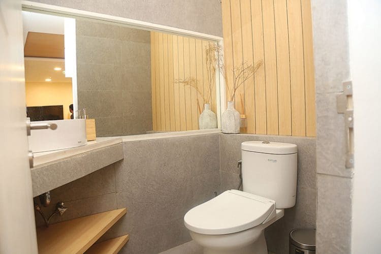 Nuansa Jepang juga ditemukan di powder room atau toilet tamu. Pemilihan warna natural seperti abu-abu batu serta elemen kayu membuat tamu serasa sedang berkunjung ke rumah-rumah Jepang.