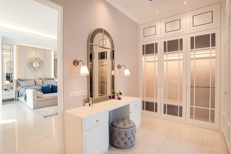 Wardrobe berada dalam satu area dengan meja rias lengkap dengan cerminnya. Panjang disesuaikan dengan lebar dinding space. Wardrobe ditempatkan pada dua sisi dinding, menjulang hingga ke langit-langit ruangan.