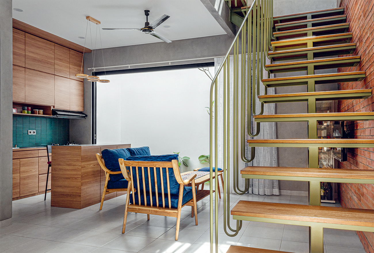 Tangga pun menjadi elemen menarik di rumah itu. Dengan warna olive green, tangga tersebut kontras dengan sekelilingnya sekaligus membuatnya tampak eye-catching. Meski fasad cenderung masif, area dalam rumah tetap terang dengan penerapan skylight yang menciptakan bayangan cahaya pada area tangga dan dinding bata ekspos. (adn/c7/nor)