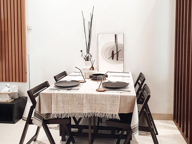 Furnitur compact juga diterapkan pada area publik. Misalnya, ruang makan. Ririe menempatkan sebuah meja kayu yang bisa dilipat hingga menyerupai kabinet kecil. Set meja dan kursi itu cukup untuk empat orang. Jika meja tersebut dilipat, ruang makan pun terasa lapang sehingga bisa digunakan untuk banyak hal.