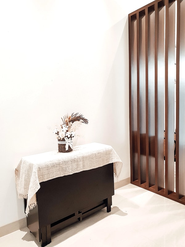 Saat ditutup, meja itu pun terlihat clean dan bisa digunakan sebagai meja biasa. ’’Disiapkan juga tempat hair dryer dan catokan di situ, ditambah stopkontak juga tidak jauh dari situ agar memudahkan karena saya sering memakainya,’’ katanya. Warna dan material kayu pada meja tersebut masih sesuai dengan nuansa putih-cokelat yang diusung di rumah Ririe.