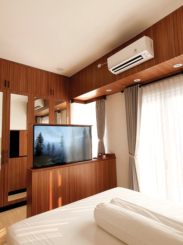 Salah satu caranya adalah memilih furnitur yang mencakup beragam fungsi sekaligus. Misalnya, kabinet TV di kamar tidur utama. Kamar itu hanya berukuran 3,5 x 5,5 meter. Namun, Ririe ingin memiliki walk in closet sekaligus space untuk merias diri. Karena itu, dibuatlah sebuah kabinet TV dengan sistem lift. TV bisa dimunculkan ke atas jika ingin digunakan, lalu disembunyikan ke dalam kabinet jika tidak sedang digunakan.