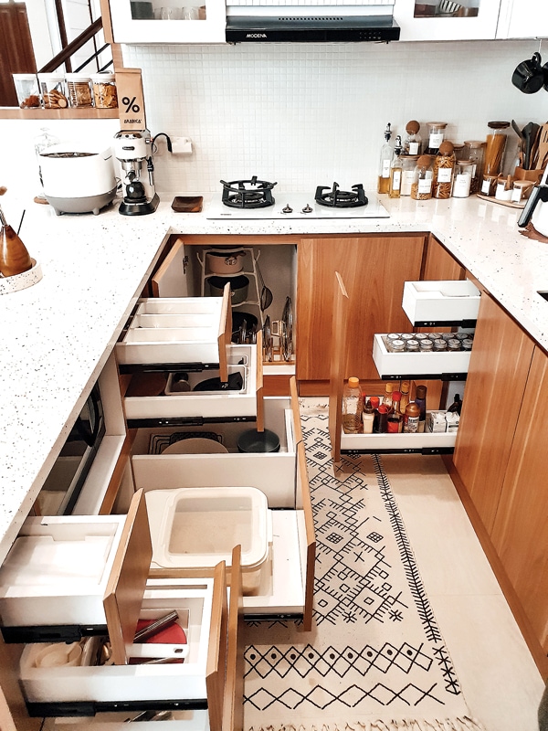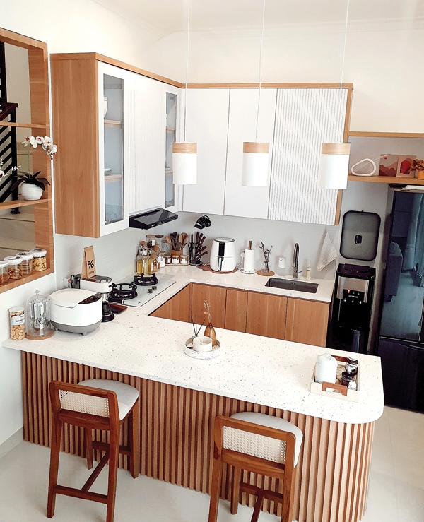 Nah, area dapur rumah Ririe itu juga menjadi salah satu spot paling menarik. Awalnya dapur tersebut berbentuk L. Namun, Ririe dan suami sepakat mengubahnya menjadi bentuk U agar lebih banyak ruang penyimpanan. Ririe pun sangat detail mengelola space penyimpanan di dapur. ’’Ada tempat beras yang ukurannya disesuaikan sejak awal mendesain, terus ada tempat menyimpan bumbu. Jadi, waktu request ke desainer interior itu sudah dipikirkan space ini mau diisi apa aja,’’ tandasnya.