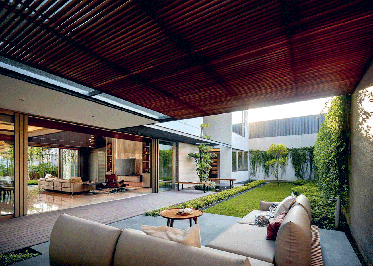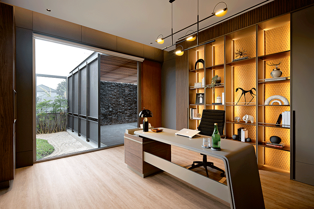 Pada bagian tengah fasad tampak screen kayu yang fleksibel. Screen itu bisa dibuka dan ditutup sesuai keinginan. ”Misal, saat pagi ada matahari dari timur, screen dibuka sedikit 45 derajat,” tutur Clement kepada Jawa Pos. Udara bisa menembus ke dalam tanpa membuat ruangan terlalu panas. Di balik screen itu sendiri merupakan selasar menuju kamar dan ruang baca.