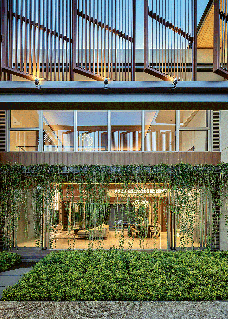 Clement menghindari fasad rumah yang terlalu tertutup rapat. Selain menggunakan screen, caranya menghalau pandangan orang luar terhadap bagian dalam rumah adalah dengan menciptakan layer. Dimulai dari pagar yang menggunakan perforated metal yang masih see-through. Lalu, lapisan kedua adalah tanaman. Tengok saja tanaman lee kuan yew yang menjuntai bagaikan vitrase.