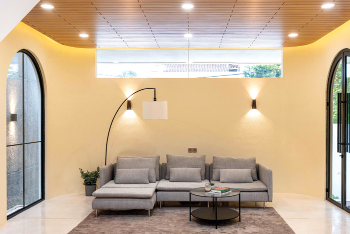 Elemen lengkung itu diawali pada fasad. Di fasad tersebut ada dua jendela besar yang ikut melengkung. Di balik jendela itu sendiri terdapat kamar utama dan kamar anak. ’’Selain menjadi keunikan project ini, jendela lengkung itu menunjukkan kemampuan cratfsmanship di lapangan,’’ ujarnya.