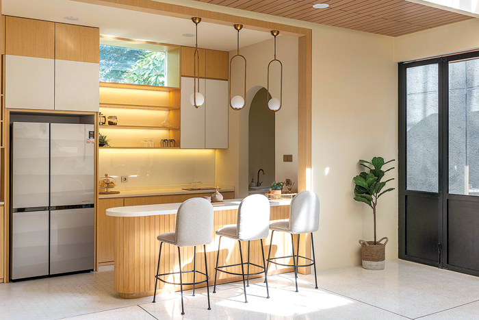 Lengkungan-lengkungan itu juga terlihat pada interior. Hendro menerapkannya lewat pintu hingga furnitur. Misalnya, kabinet di kamar utama, ranjang, dan kursi di dining area.