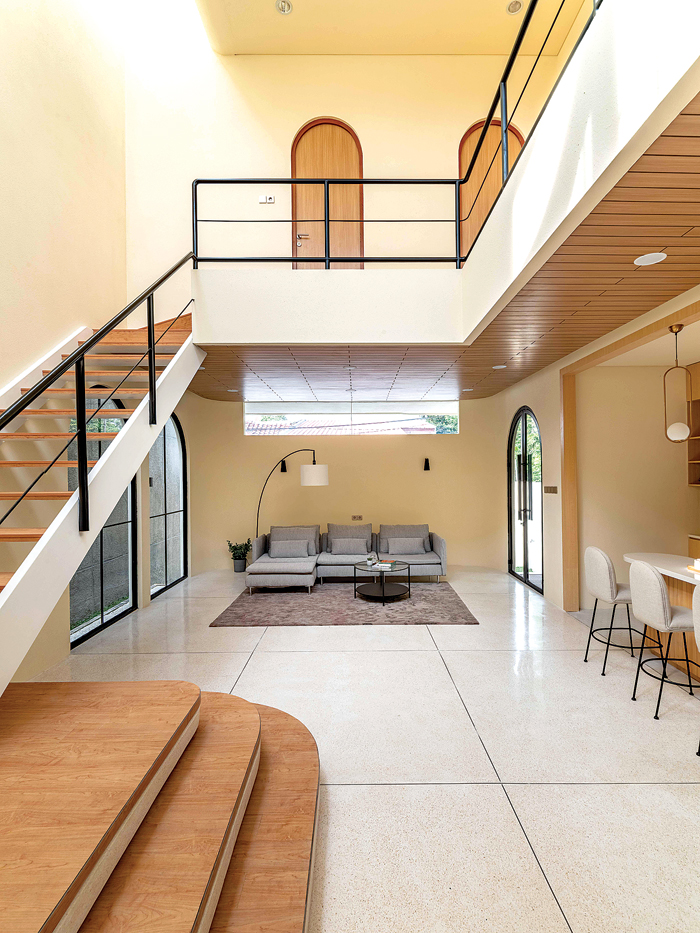 Kendati memiliki dua lantai, rumah tersebut dibikin mezzanine. Tujuannya agar double volume dan mengurangi biaya konstruksi, tetapi menambah nilai bangunan. Mezzanine mengurangi cost pengerjaan lantai dua. Di sisi lain, rumah itu mempunyai void yang membuat ruang keluarga terasa lebih lapang dan nyaman.