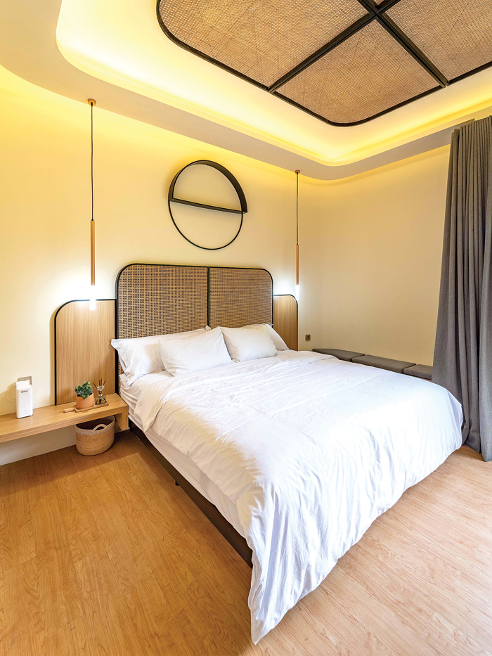 Untuk menambah kesan homey, disematkan beberapa elemen kayu. Ranjang dan kabinet di kamar utama terbuat dari rotan asli. Ada pula material sintetis yang mengadopsi warna dan motif kayu. Misalnya, HPL pelapis plafon dan WPC di area eksterior.