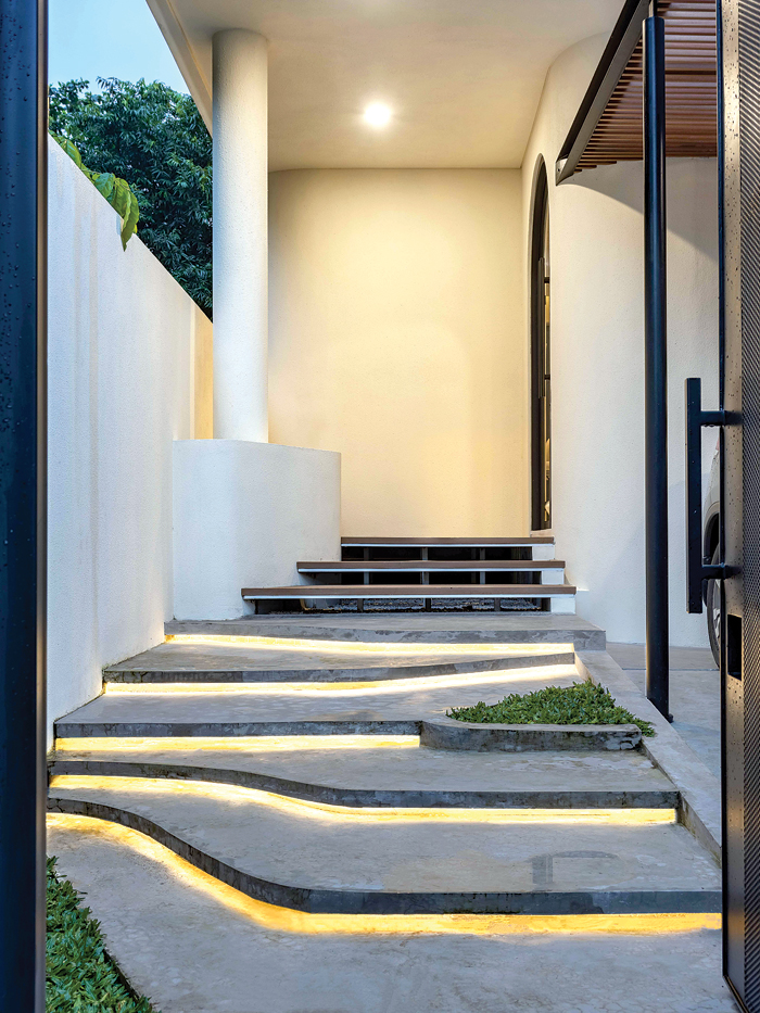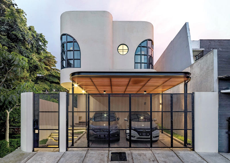 Ketegasan diaplikasikan lewat garis dan blok massa yang tegas. Kemudian sisi quirky ditampilkan lewat lengkungan-lengkungan pada rumah itu. Hendro sendiri menyebutnya sebagai elemen Arc. ’’Ketegasan dan quirky bisa bertemu meski secara tata massa kesannya solid dan masif. Lengkungan memberi kesan lembut dan lucu,’’ ucapnya.