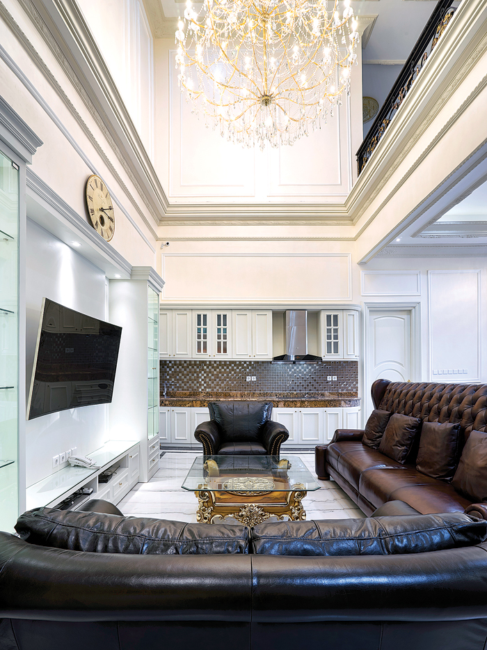 • Selain permainan hidden lamp yang menunjukkan unsur modern, rumah ini tetap menggunakan lampu gantung (chandelier) besar di beberapa ruangan utama. Misalnya di ruang keluarga, di mana plafon juga dibuat sangat tinggi.